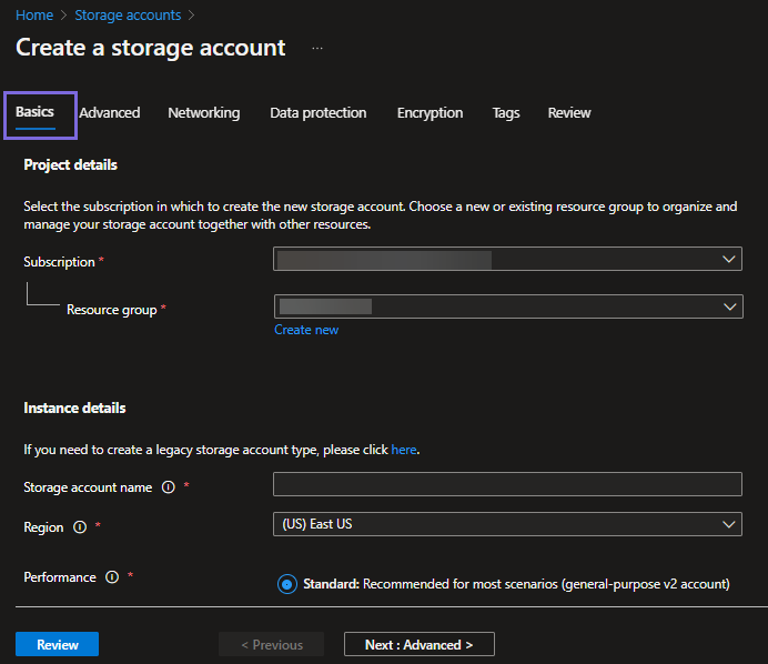 | Basics: Instance details | Resource group | String | Required. You can create a new resource group for this storage account, or select an existing one. Learn more about , Resource groups. |