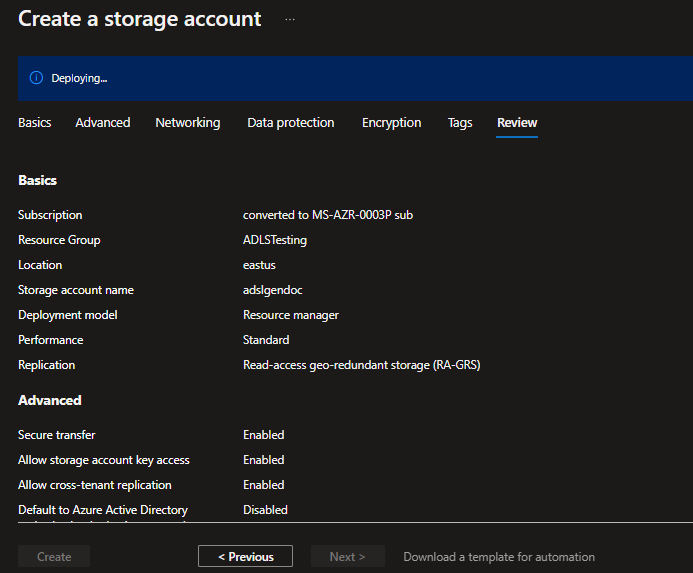 | Enable storage account key access | Checkbox | Optional. When enabled, this setting allows clients to authorize requests to the storage account using either the account access keys or an Azure Active Directory (Azure AD) account (default). For more information, refer to Prevent Shared Key authorization for an Azure Storage account. | |
