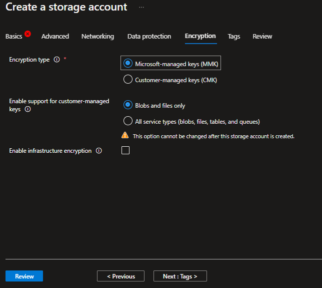 | Encryption | Enable support for customer-managed keys | Radio button | By default, customer managed keys can be used to encrypt only blobs and files. Set this option to All service types (blobs, files, tables, and queues) to enable support for customer-managed keys for all services. You are not required to use customer-managed keys if you choose this option. |