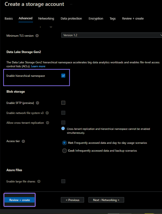 | Enable hierarchical namespace | Checkbox | Optional. For more information, refer to Introduction to Azure Data Lake Storage