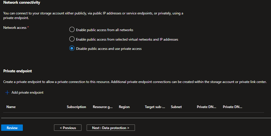 | Networking | Network access | Radio button | Required. By default, incoming network traffic is routed to the public endpoint for your storage account. |