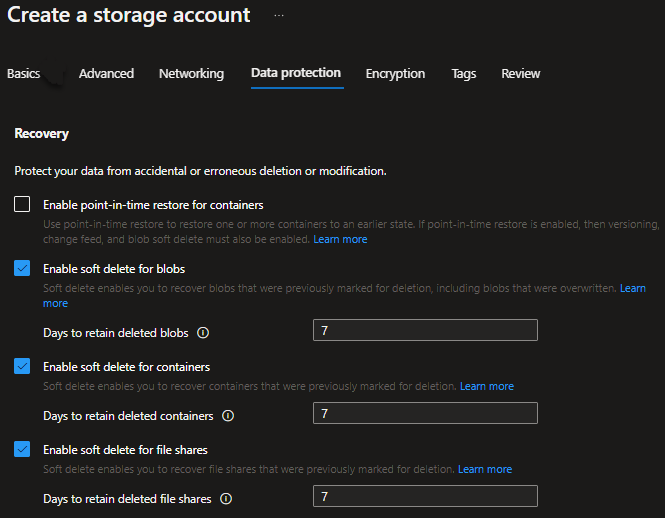 | Enable soft delete for blobs | Checkbox | Optional. Blob soft delete protects an individual blob, snapshot, or version from accidental deletes or overwrites by maintaining the deleted data in the system for a specified retention period. | |