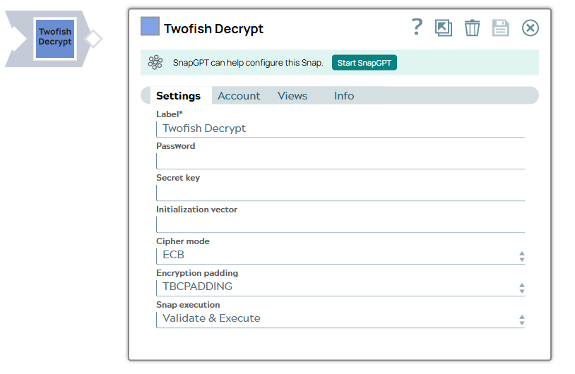 | Label | String | Required. Specify a unique name for the Snap. Modify this to be more appropriate, especially if more than one of the same Snaps is in the pipeline. Default value: Twofish Decrypt Example: Twofish Decrypt |