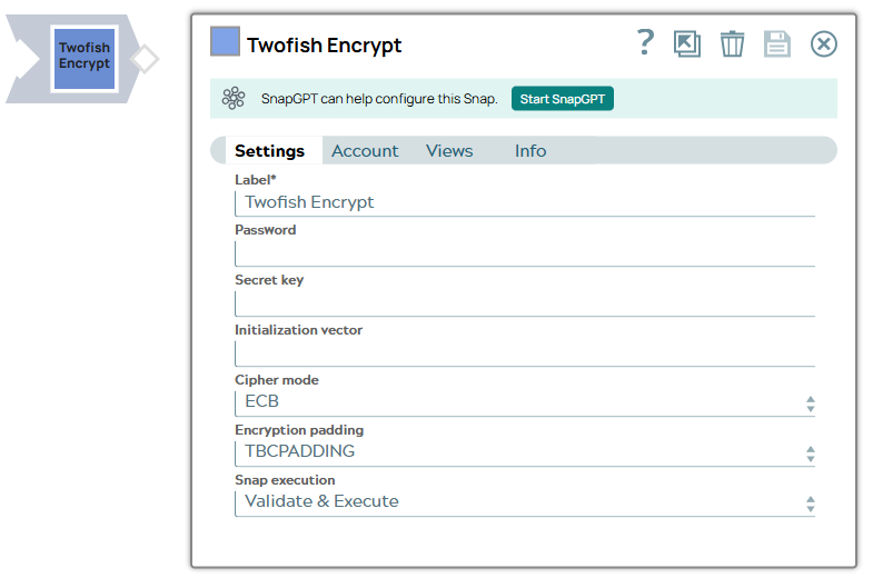 | Label | String | Required. Specify a unique name for the Snap. Modify this to be more appropriate, especially if more than one of the same Snaps is in the pipeline. Default value: Twofish Encrypt Example: Twofish Encrypt |