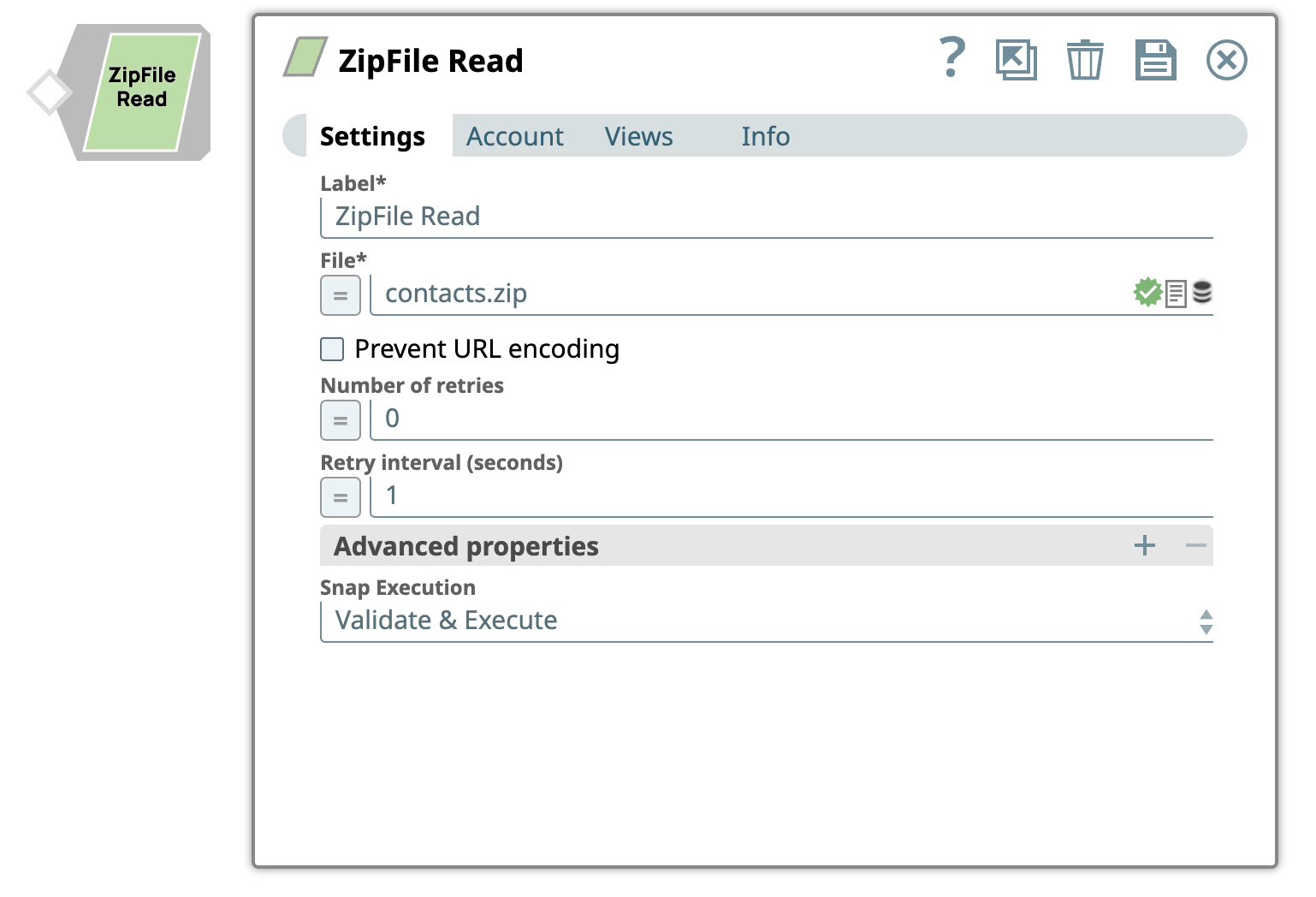 | Label | String | Required. Specify a unique name for the Snap. Modify this to be more appropriate, especially if more than one of the same Snaps is in the pipeline. Default value: ZipFile Read Example: ZipFile Read |