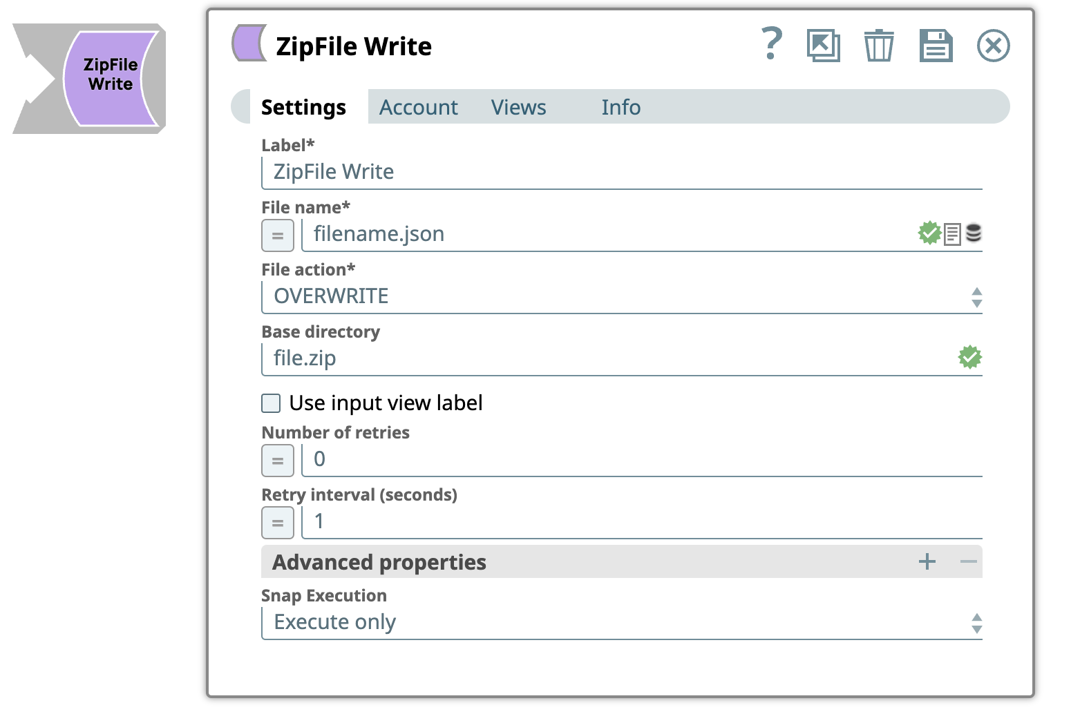 | Label | String | Required. Specify a unique name for the Snap. Modify this to be more appropriate, especially if more than one of the same Snaps is in the pipeline. Default value: ZipFile Write Example: ZipFile Write |