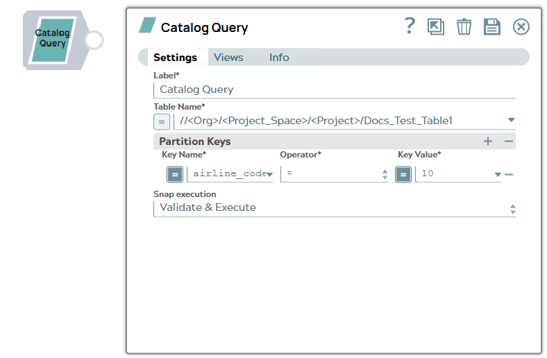 | Label | String | Required. Specify a unique name for the Snap. Modify this to be more appropriate, especially if more than one of the same Snaps is in the pipeline. Default value: Catalog Query Example: Catalog Query |
