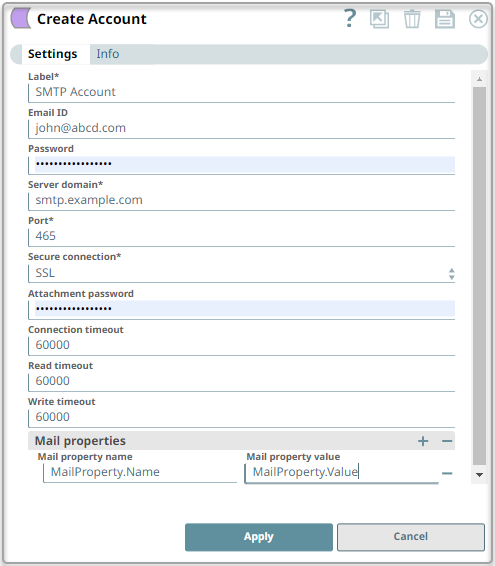 | Read timeout | Integer | Specify the time duration in milliseconds, in the event of a read