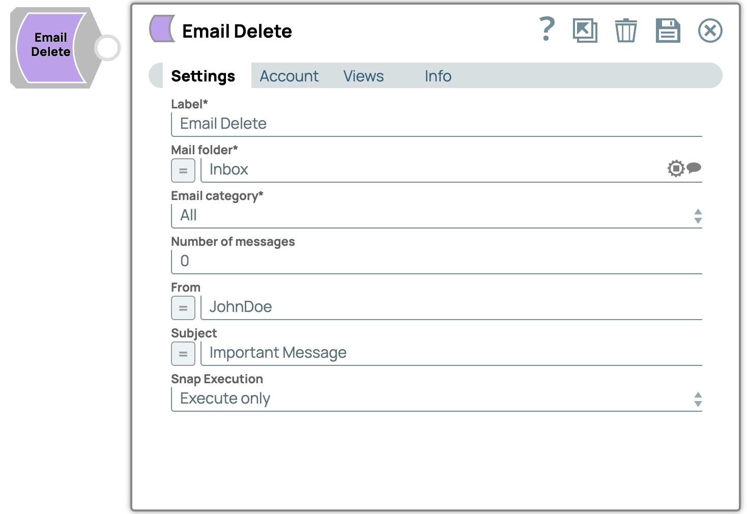 | Label | String | Required. Specify a unique name for the Snap. Modify this to be more appropriate, especially if more than one of the same Snaps is in the pipeline. Default value: Email Delete Example: Email_Delete |