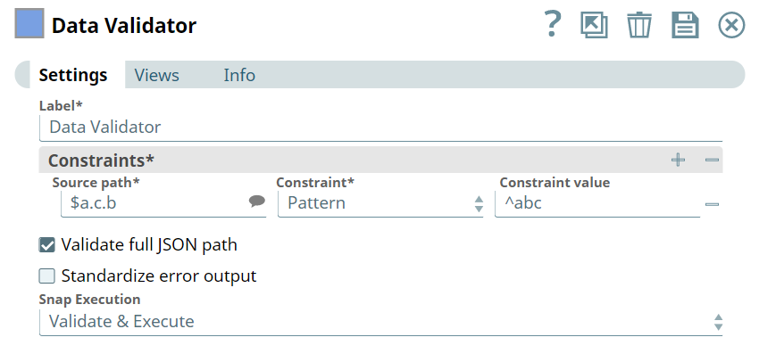 | Label | String | Required. Specify a unique name for the Snap. Modify this to be more appropriate, especially if more than one of the same Snaps is in the pipeline. Default value: Data Validator Example: Data Validator |