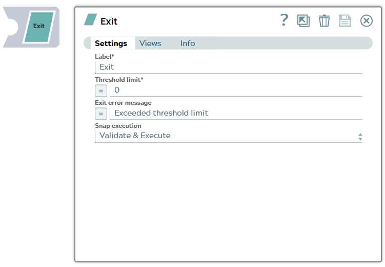 | Label | String | Required. Specify a unique name for the Snap. Modify this to be more appropriate, especially if more than one of the same Snaps is in the pipeline. Default value: Exit Example: Exit Transaction |