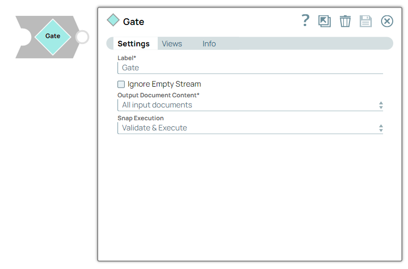 | Label | String | Required. Specify a unique name for the Snap. Modify this to be more appropriate, especially if more than one of the same Snaps is in the pipeline. Default value: Gate Example: Ensure Complete Execution |