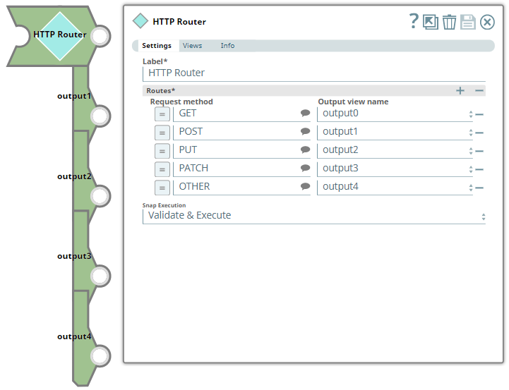 | Label | String | Required. Specify a unique name for the Snap. Modify this to be more appropriate, especially if more than one of the same Snaps is in the pipeline. Default value: HTTP Router Example: HTTP Router |