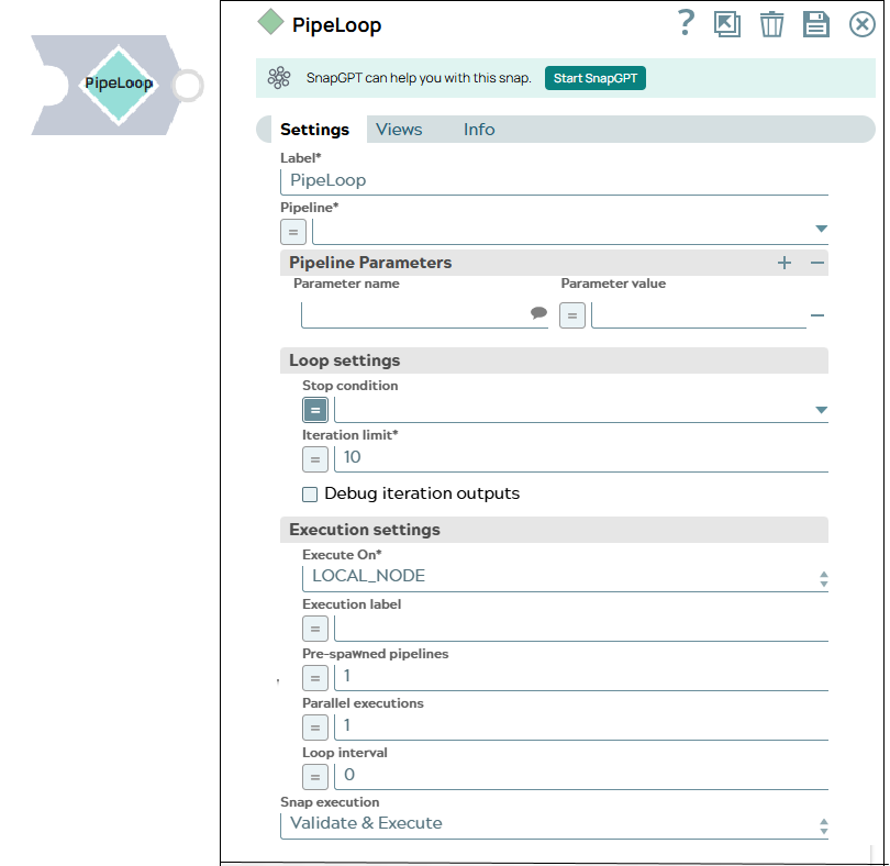 | Label | String | Required. Specify a unique name for the Snap. Modify this to be more appropriate, especially if more than one of the same Snaps is in the pipeline. Default value: PipeLoop Example: SimpleLoop |