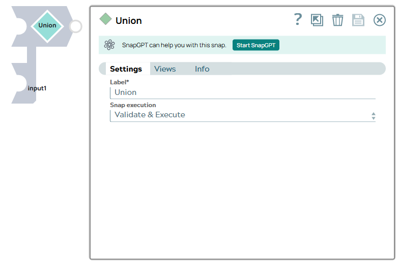 | Label | String | Required. Specify a unique name for the Snap. Modify this to be more appropriate, especially if more than one of the same Snaps is in the pipeline. Default value: Union Example: Union |