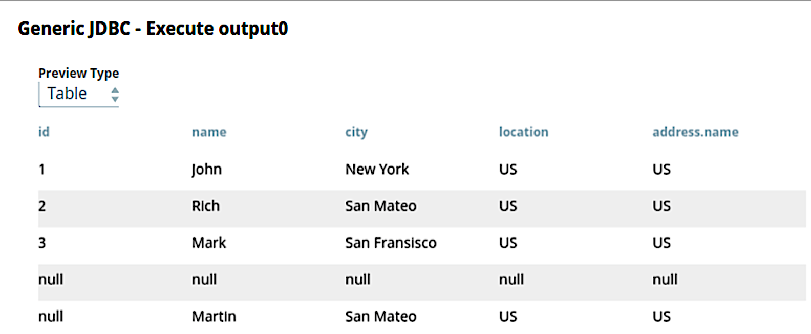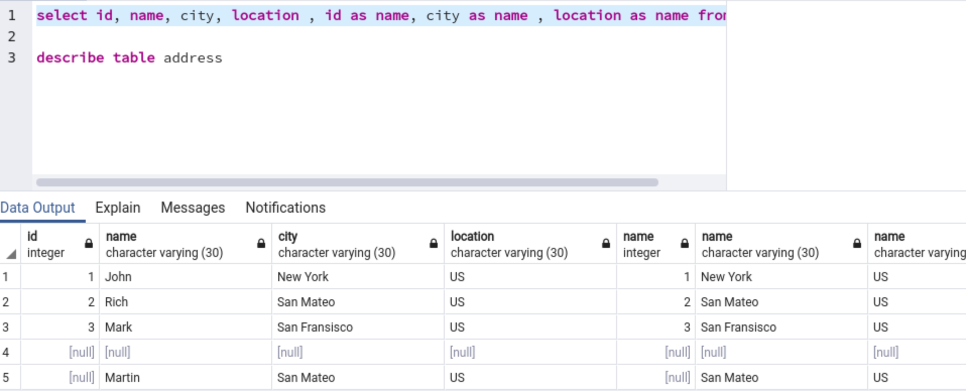 name" is repeated three times:select id, name, city, location, id as name, city as name, location as name from addressExpected output: