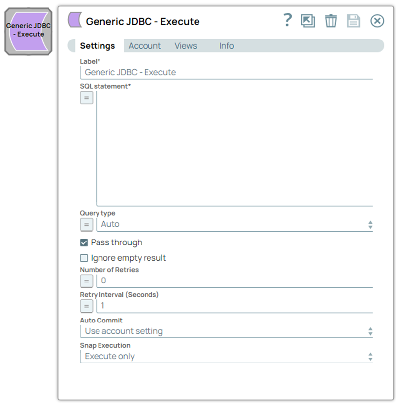 | Label | String | Required. Specify a unique name for the Snap. Modify this to be more appropriate, especially if more than one of the same Snaps is in the pipeline. Default value: Generic JDBC - Execute Example: Execute EmployeeRecords |