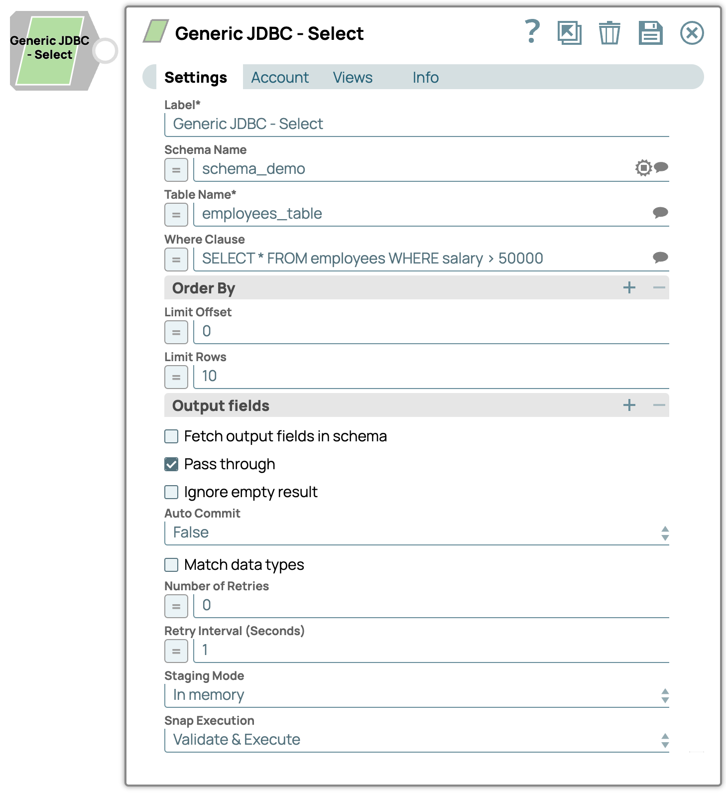 | Label | String | Required. Specify a unique name for the Snap. Modify this to be more appropriate, especially if more than one of the same Snaps is in the pipeline. Default value: Generic JDBC - Select Example: Generic JDBC - Select |