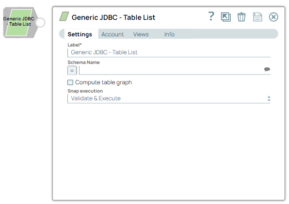 | Label | String | Required. Specify a unique name for the Snap. Modify this to be more appropriate, especially if more than one of the same Snaps is in the pipeline. Default value: Generic JDBC - Table List Example: Load Employee Tables |