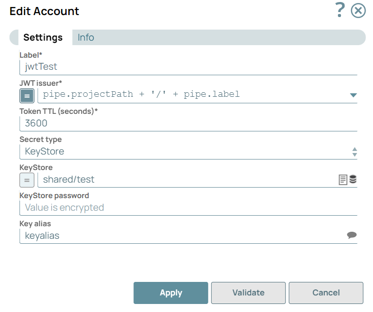 | JWT Issuer | Dropdown list/Expression | Specify the principal entity that issues the JWT. Default value: pipe.projectPath + '/' + pipe.label |