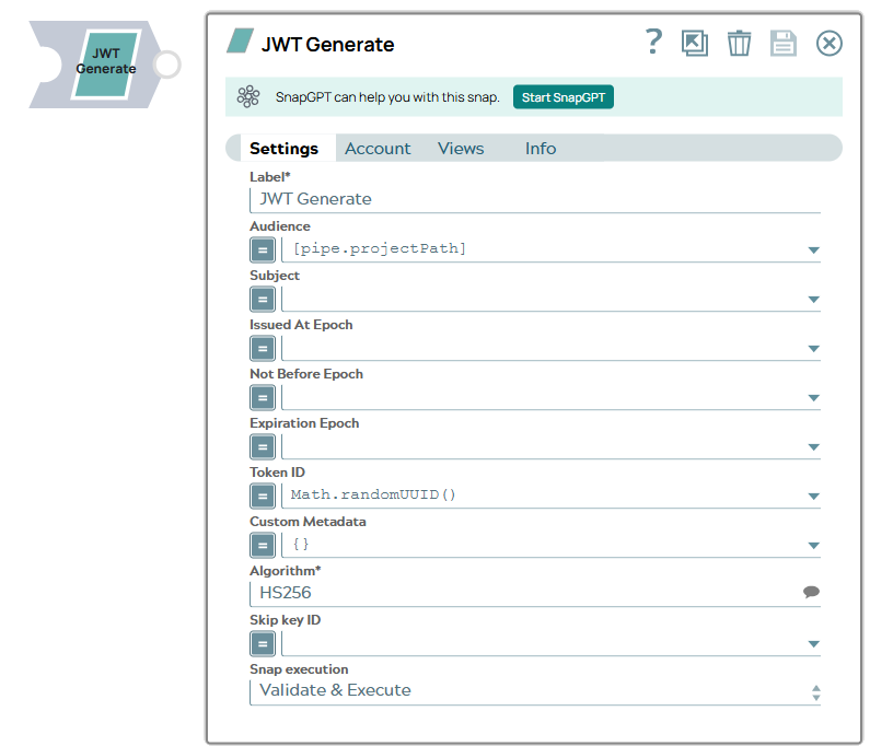 | Label | String | Required. Specify a unique name for the Snap. Modify this to be more appropriate, especially if more than one of the same Snaps is in the pipeline. Default value: JWT Generate Example: JWT Generate |