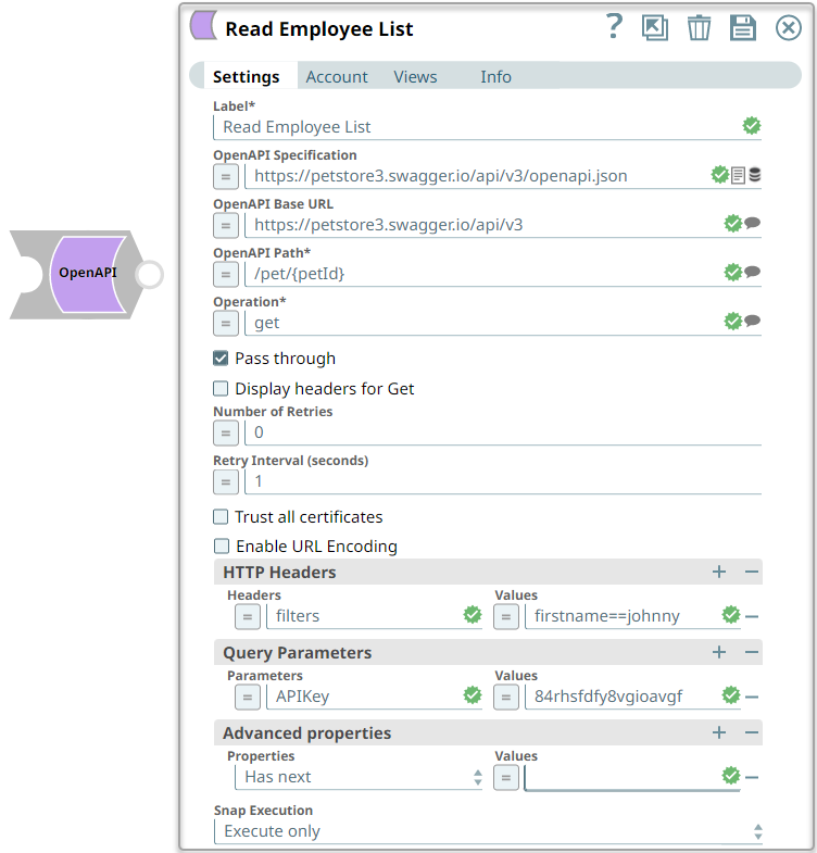 | Label | String | Required. Specify a unique name for the Snap. Modify this to be more appropriate, especially if more than one of the same Snaps is in the pipeline. Default value: OpenAPI Example: Read Employee List |