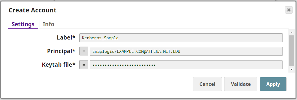 principals. See Keytab for more details. Default value: None. Example: /keytabs/snaplogic.keytab |