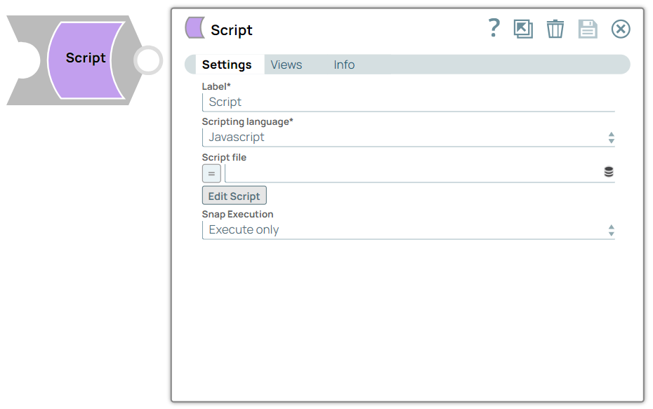 | Label | String | Required. Specify a unique name for the Snap. Modify this to be more appropriate, especially if more than one of the same Snaps is in the pipeline. Default value: Script Example: Script |