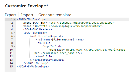 The editor allows you to save SOAP envelopes in SnapLogic's file system or import