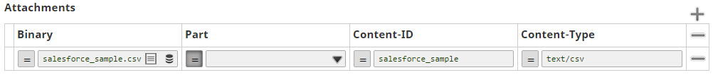 the attachment within the SOAP request envelope. The following example shows how contents of the file, salesforce_sample.csv, are inserted into the SOAP response and what updates are required to the Snap. After selecting