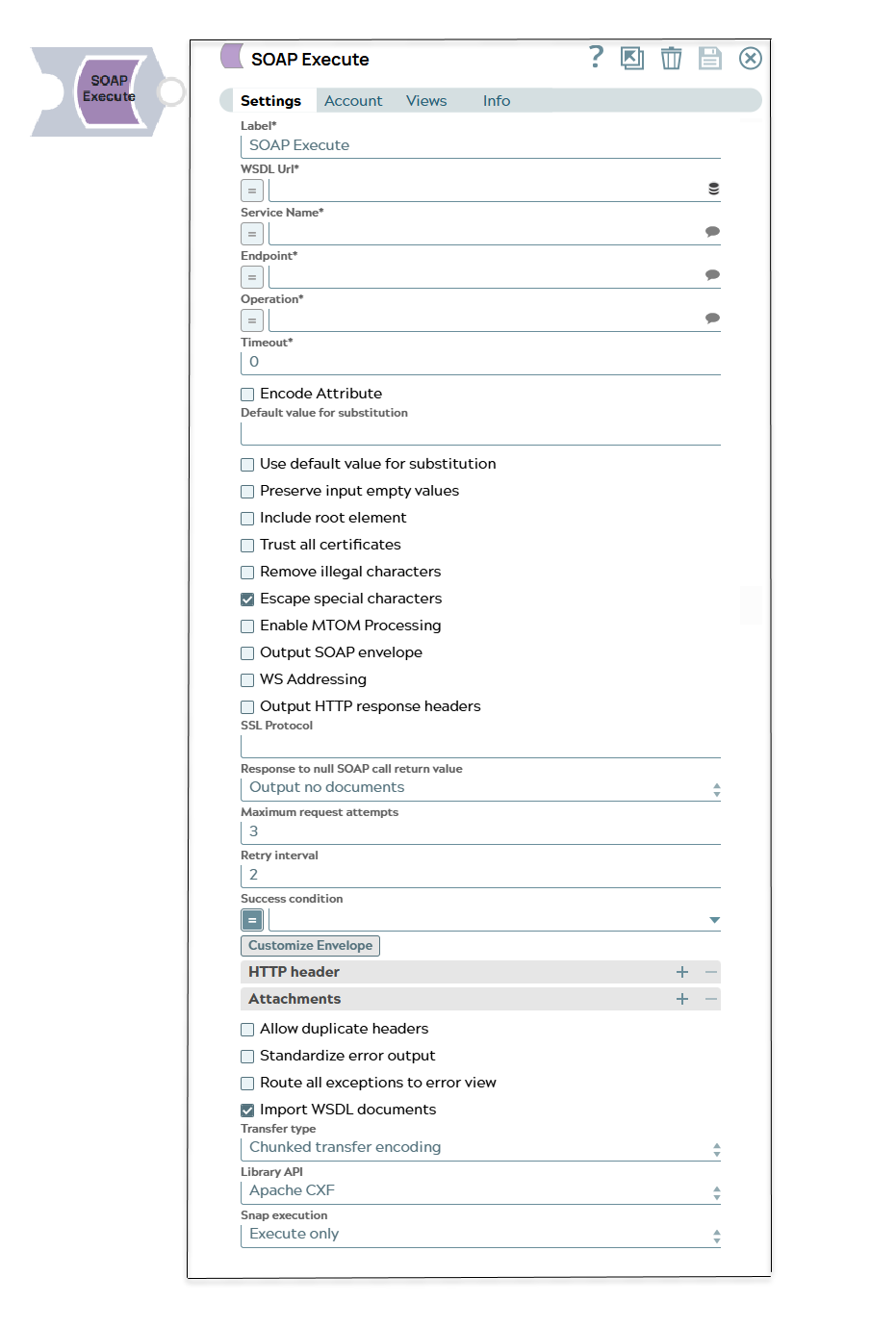 | Label | String | Required. Specify a unique name for the Snap. Modify this to be more appropriate, especially if more than one of the same Snaps is in the pipeline. Default value: SOAP Execute Example: SOAP Execute |