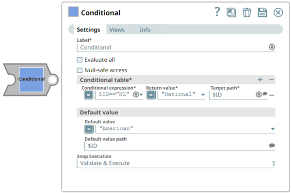 You can use this Snap to mimic an IF statement in most programming languages. Each row of the conditional table is equivalent to an if/else if block in an if statement. The Default value property is equivalent to the else block. The first condition that evaluates to true has its value set into the provided target path, and no other conditions are evaluated. If no conditions evaluate to true, the default value (if set) is written. If Evaluate all is selected, the Snap evaluates all conditions and writes return values to their corresponding target paths.