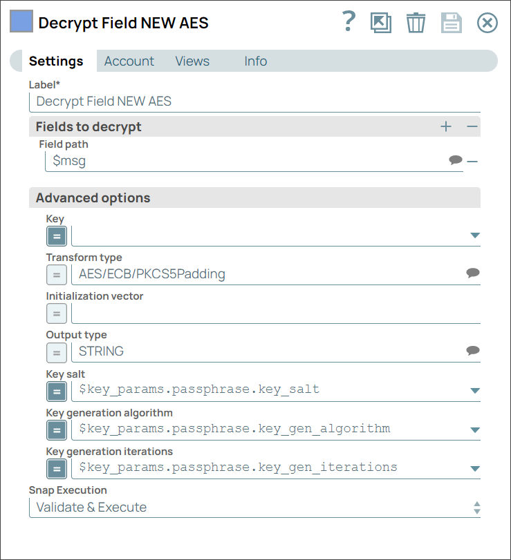 | Label | String | Required. Specify a unique name for the Snap. Modify this to be more appropriate, especially if more than one of the same Snaps is in the pipeline. Default value: Decrypt Field Example: Decrypt Field |
