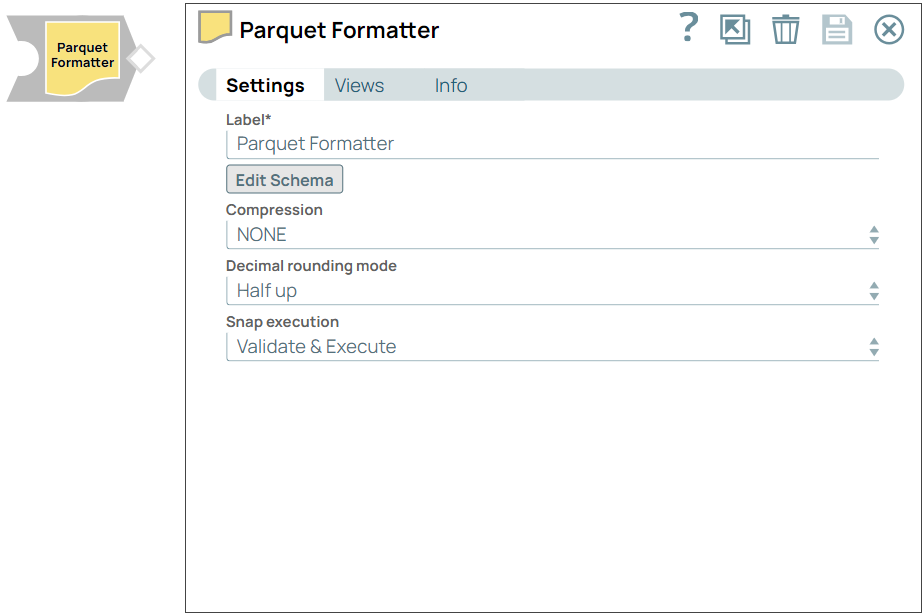 Required. Specify a unique name for the Snap. Modify this to be more appropriate, especially if more than one of the same Snaps is in the pipeline. Default value: Parquet Formatter Example: Parquet Formatter |
