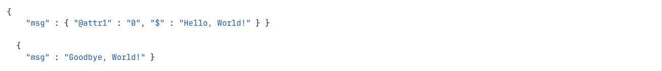 The conversion from the internal JSON structure to XML follows the StAXON mapping convention. This mapping uses naming conventions to turn JSON object fields into XML nodes and attributes.