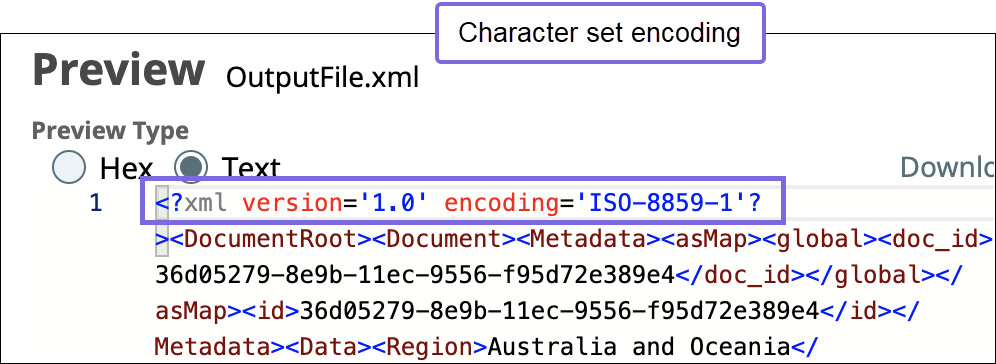 | Output Character Set | String/Expression/ Suggestion | Required. Specify or select the character set encoding for the output. ![]() ![]() Default value: UTF-8 Example: ISO860 |