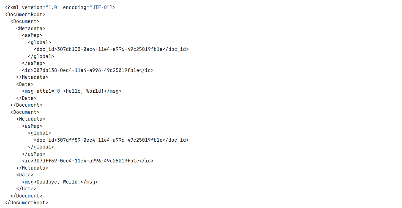 | Root element | String | Specify the name of the XML element under which all the incoming documents are added. If left blank, no wrapping is done and each document is written out as a separate binary. Default value: None. Example: DocumentRoot |
