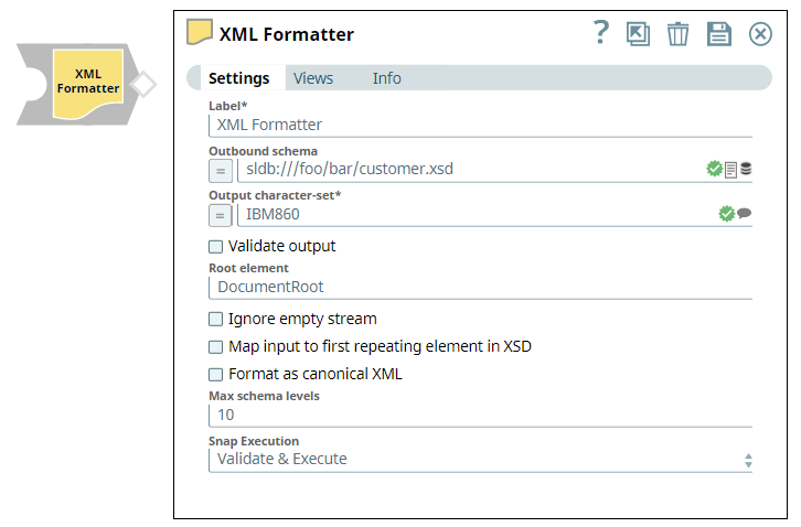 | Label | String | Required. Specify a unique name for the Snap. Modify this to be more appropriate, especially if more than one of the same Snaps is in the pipeline. Default value: XML Formatter Example: XML Formatter |