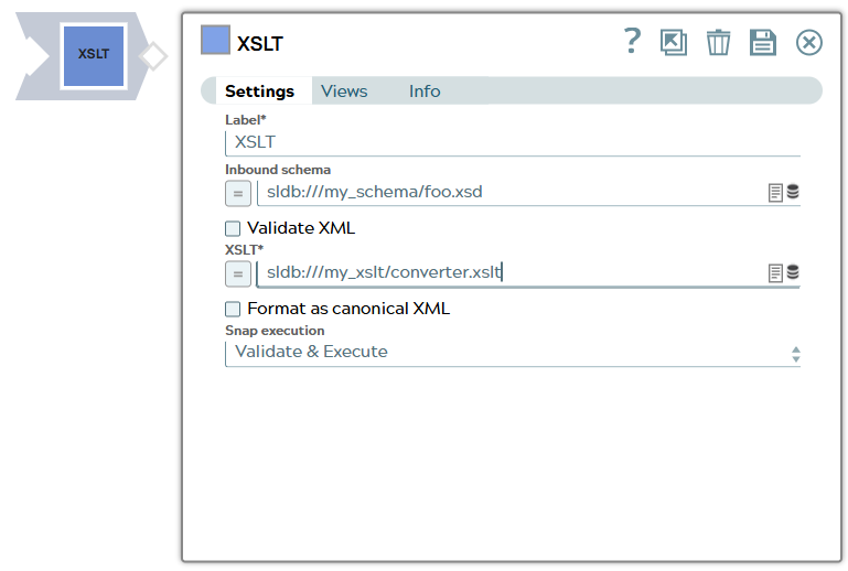 | Label | String | Required. Specify a unique name for the Snap. Modify this to be more appropriate, especially if more than one of the same Snaps is in the pipeline. Default value: XSLT Example: XSLT |