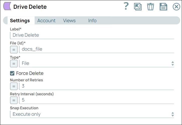 | Number of Retries | Integer/Expression | Enter the integer value to specify the number of attempts the Snap should make to perform the selected operation in case of connection failure or timeout.