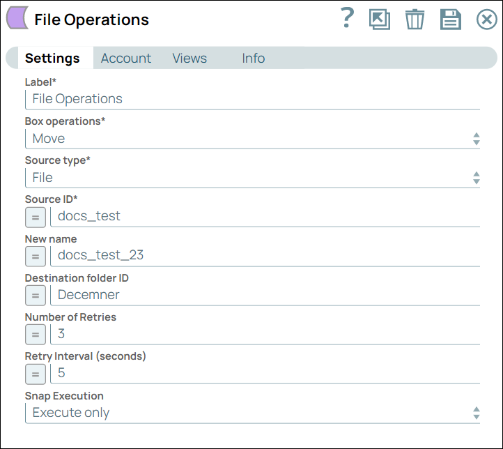 | Number of Retries | Integer/Expression | Enter the integer value to specify the number of attempts the Snap should make to perform the selected operation in case of connection failure or timeout.