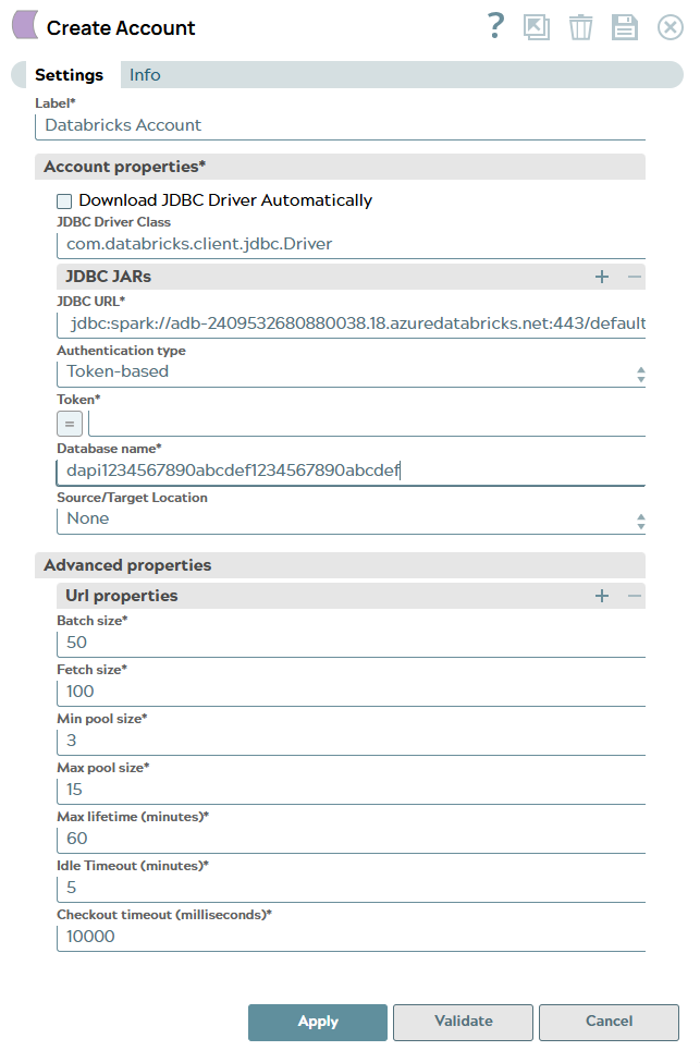 | Account Properties | Use this field set to configure the information required to establish a JDBC connection with the account. | |