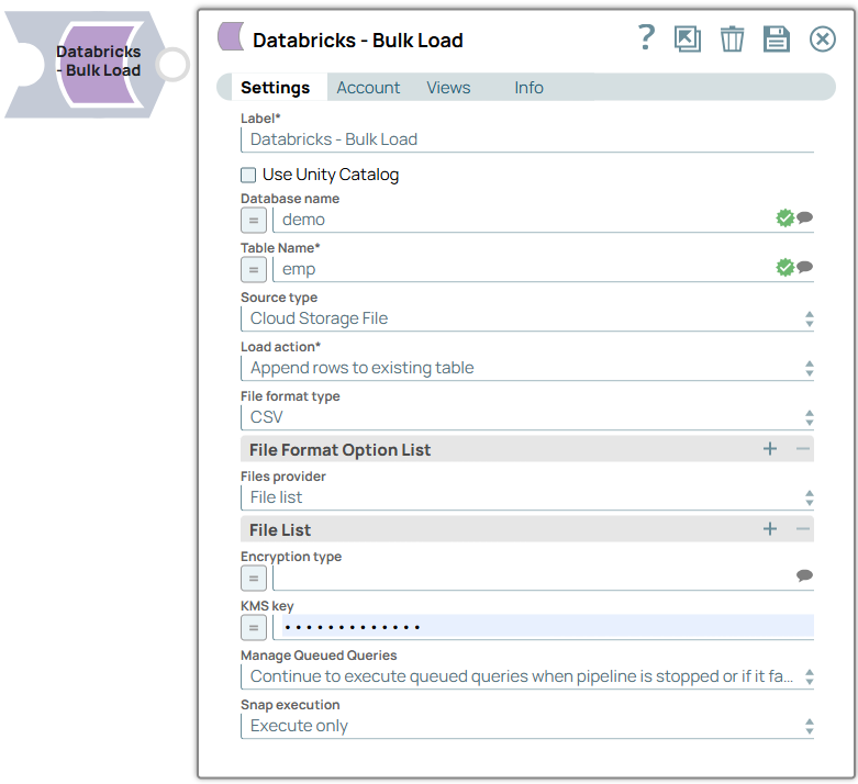 insert into" command, which is slower in performance compared to the "copy into" command. This performance issue only occurs with Input views. For other cloud sources, the "copy into" command functions properly. - The Databricks - Bulk Load Snap fails to execute the DROP AND CREATE TABLE and ALTER