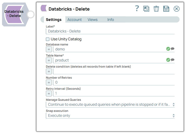 You can use this Snap to execute a Databricks SQL DELETE statement based on specific conditions. Ensure adequate discretion while using this Snap as it can truncate the table if run without specifying a WHERE condition for the DELETE statement.