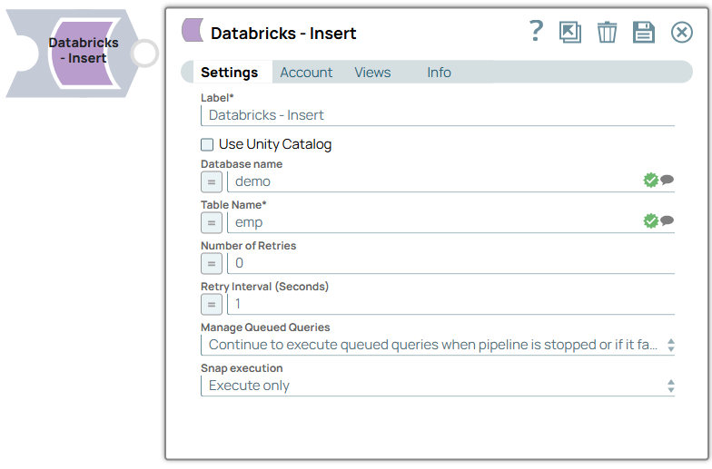 You can use this Snap to run a Databricks SQL Insert statement with a set of values to insert in the target Databricks Lakehouse Platform (DLP) table. The Snap treats each key-value pair specified in the input document as the column to insert into, and the corresponding value to insert. For the columns not specified in the input document, the Snap inserts null values in the row.