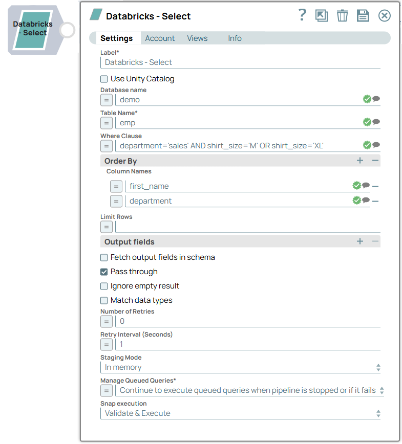 | Label | String | Required. Specify a unique name for the Snap. Modify this to be more appropriate, especially if more than one of the same Snaps is in the pipeline. Default value: Databricks - Select Example: DLP Select |