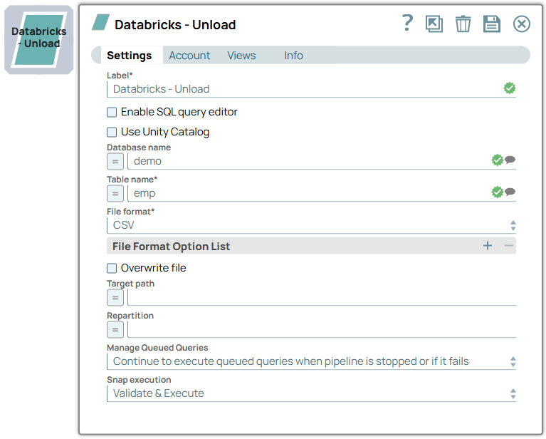 | Label | String | Required. Specify a unique name for the Snap. Modify this to be more appropriate, especially if more than one of the same Snaps is in the pipeline. Default value: Databricks - Unload Example: ELT RS Account |