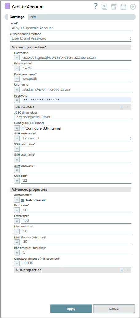 | Account properties | Account configuration to establish a connection to the PostgreSQL database. | |