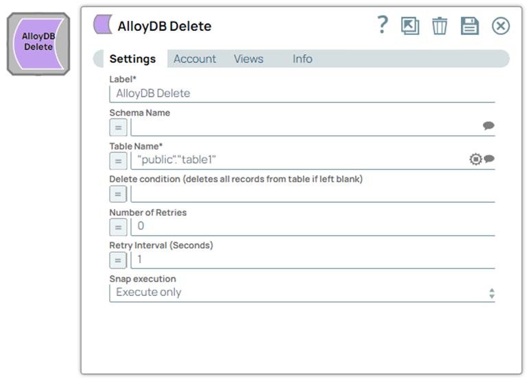 | Label | String | Required. Specify a unique name for the Snap. Modify this to be more appropriate, especially if more than one of the same Snaps is in the pipeline. Default value: AlloyDB Delete Example: AlloyDB Delete |
