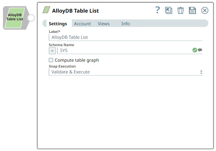 | Label | String | Required. Specify a unique name for the Snap. Modify this to be more appropriate, especially if more than one of the same Snaps is in the pipeline. Default value: AlloyDB Table List Example: List Tables |